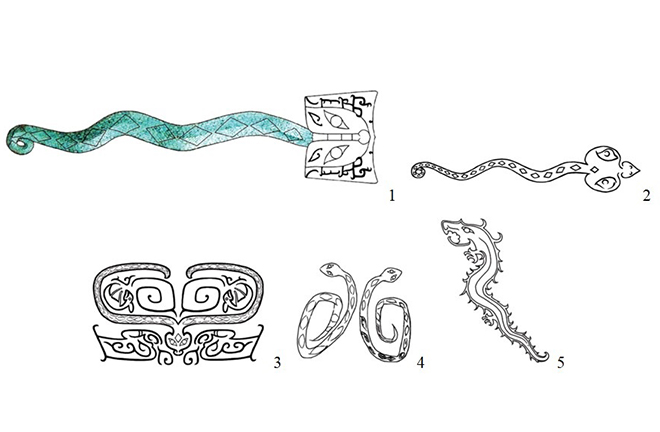 The restoration drawings of the turquoise dragon-shaped object unearthed from the Erlitou site (1), the snake-like pattern on the pottery vessel (Ⅴ·ⅡT107) from Erlitou (2), the double-bodied snake image on the pottery fragment from pit VT212 (3); the image on the hollow-based vessel (ⅣT17②:4) from Erlitou (4), and the snake-bodied creature on the hollow-based vessel (ⅤT210④B:3、ⅤT212⑤:1) from Erlitou (5) Photo: PROVIDID TO CSST