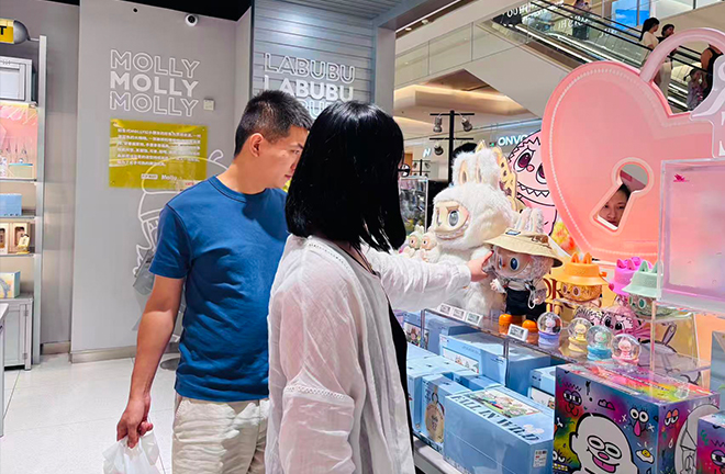 Customers talk about Labubu dolls at a shopping mall in Beijing on Aug. 31. Photo: Chen Mirong/CSST