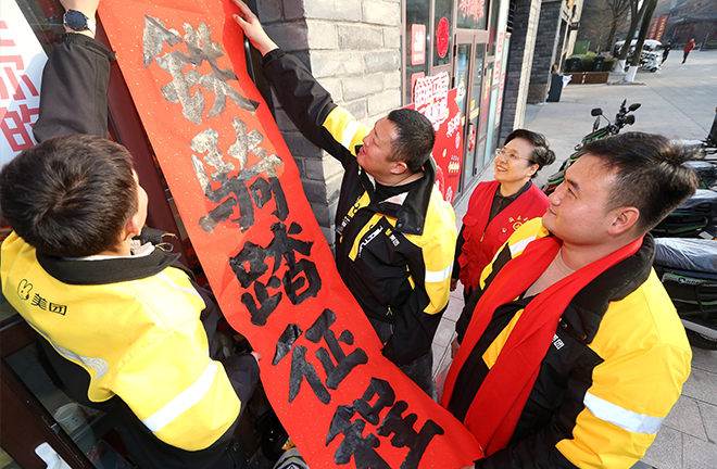 On Feb. 13, 2026, delivery workers put up Spring Festival couplets at a local service station in Jimo District, Qingdao City, Shandong Province. Photo: IC PHOTO