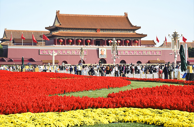 During the National Day and Mid-Autumn Festival holiday, Tiananmen Square in Beijing was beautifully decorated with vibrant flowers, creating a festive atmosphere that attracted many citizens and tourists. Photo: IC PHOTO