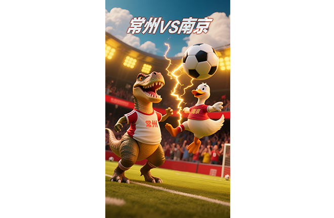 A comic depicting the fifth round of the 2025 Jiangsu Football City League, featuring a match between Changzhou and Nanjing. Changzhou is renowned for its dinosaur-themed park, while Nanjing is famous for its signature dish — salted duck Photo: IC PHOTO
